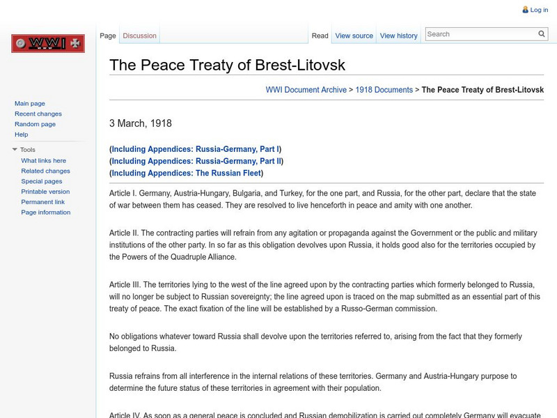 Brigham Young University offers the full text of the Peace treaty of Brest-Litovsk signed March of 1918 that officially ended Russian participation in the war.