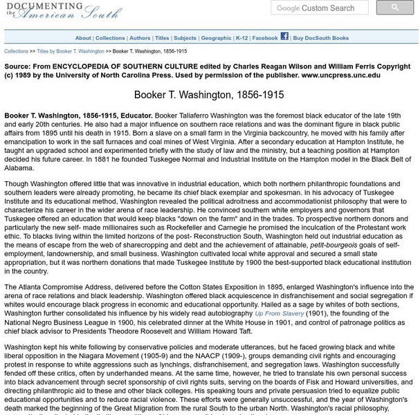Historical information on Booker T. Washington, the foremost black educator of the late 19th and 20th centuries. This site offers an overview of his greatest accomplishments, including links to his autobiography and other writings. This...