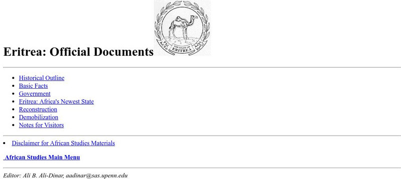 An easy-to-understand site contains basic facts about Eritrea, a historical outline, government details, reconstruction and demobilization history, and notes for visitors to the country.
