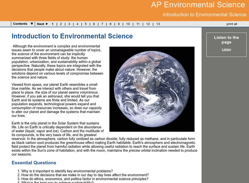An introductory module with interactive activities, class notes, lab activities, and review questions which cover advanced placement environmental science concepts.