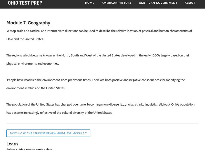Learning module with Ohio state test preparation material on Geography, including map skills and modifying the environment. Inlcudes video tutorial, interactive review game, and module assessment.