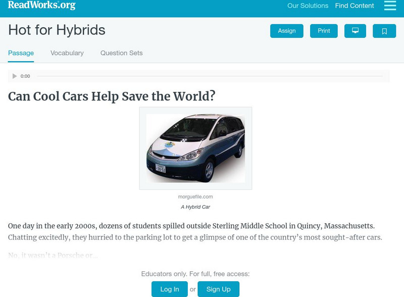 [Free Registration/Login Required] An informational text about the pros and cons of hybrid cars. A question sheet is available to help students build skills in reading comprehension.