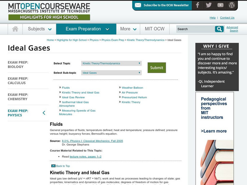 Students explore ideal gases. Some topics examined in the activities are ideal gas, kinetic theory, and fluids. The resource consists of video clips, lecture notes, practice problems, and exam questions. Practice problems and exam...