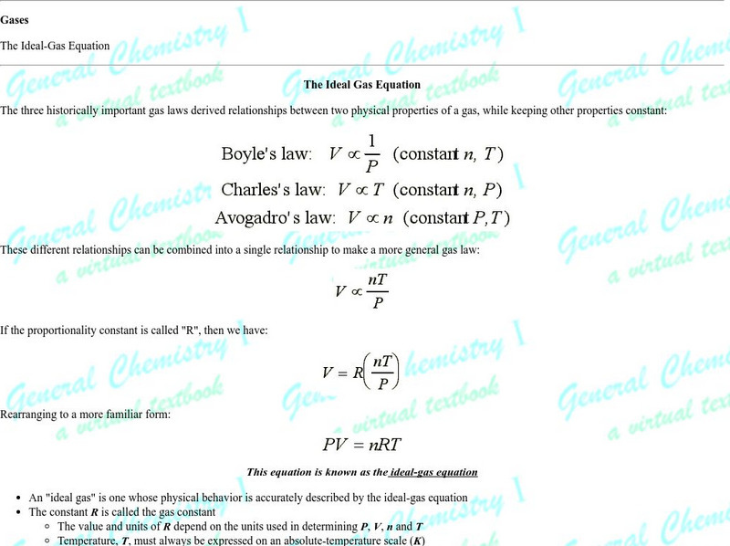 The General Chemistry Virtual Textbook, or Chem 1, is broken into several sections covering various aspects of topics related to chemistry. This section deals with the ideal gas equation and provides a series of formulas related to the...