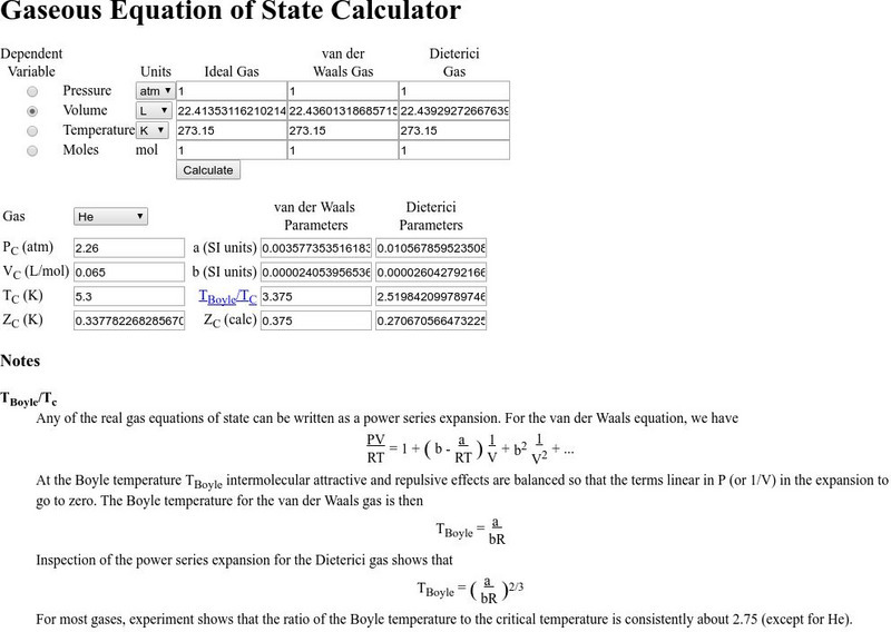 A JavaScript calculator which allows one to investigate the distinction between an ideal gas and a real (Van der Waal or Dieterici) gas. State variables can be entered and an update on the values of other variables are given (as...