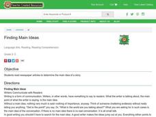 In this reading worksheet, young scholars learn to identify the main idea in a newspaper article. Students read an article about police dogs and answer 2 questions. Then young scholars choose 3 newspaper articles on their own and...