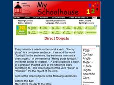 For this online interactive direct objects worksheet, students respond to 10 fill in the blank questions identifying the direct objects in 10 sentences.
