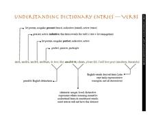 In this language arts worksheet, students look for the correct guidance for how an entry is found in a foreign language dictionary. They use the root and suffixes through breaking the word apart using the graphic organizer.