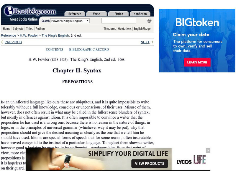 Part of H.W. Fowler's classic text on the use and misuse of the English language, "The King's English" (1908) section on prepositions focuses on their idiomatic nature. A comprehensive but a bit outdated manual, "The King's English"...