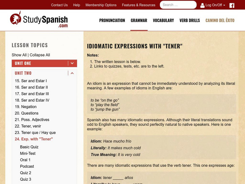 Fantastic explanation of idioms which focuses on the use of idiomatic expressions with the verb tener. This comprehensive lesson does an outstanding job of presenting idioms which use the verb tener. A short quiz, oral exercise and test...