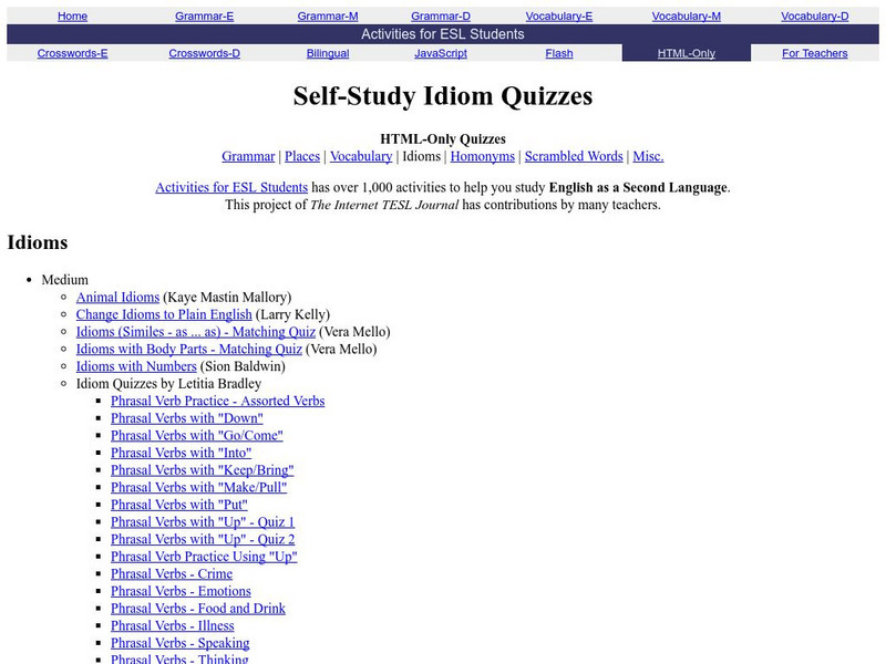 Vast array of quizzes and self-study exercises based on idioms and idiomatic expressions, categorized in a variety of ways (beginning with A, B, etc., by keyword, or by association with other groupings). Great practice for the ELL/ESL...