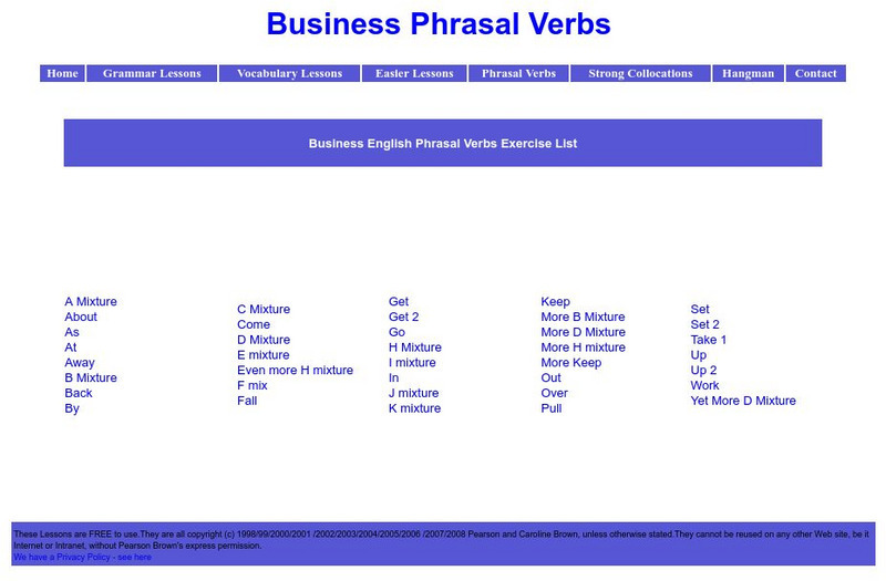 This site has interactive quizzes for advanced English language learners that tests knowledge of multiword verb expressions such as "Acting up," and "Airing out." [Site uses British versus American English.]