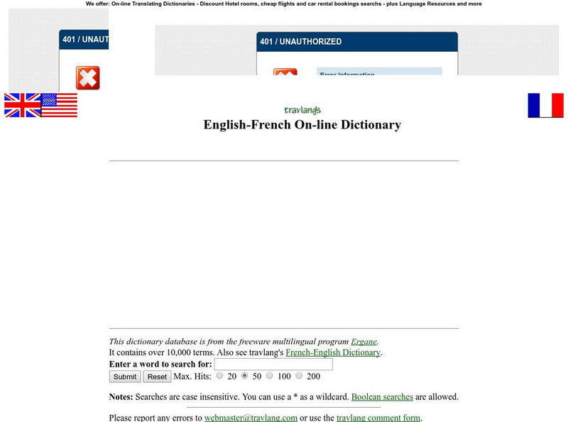 Travelang's French-English dictionary consists of 10,000 terms--definitions are given with examples and idiomatic expressions.