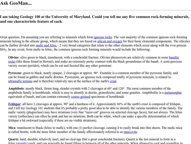 Ask GeoMan lists Olivine, Pyroxene, Amphibole, Feldspar, Mica and Quartz, as five common rock forming minerals. Characteristics of each are also given.