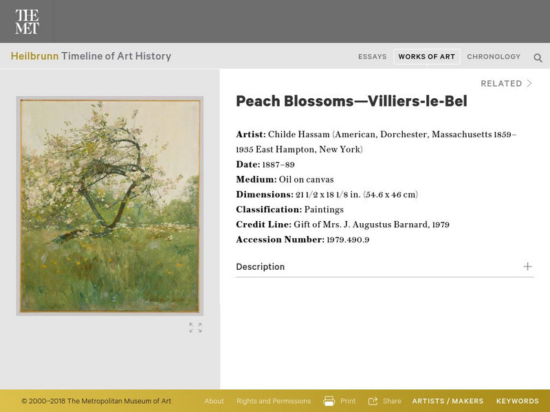 From the Metropolitan Museum of Art the painting "Peach Blossoms?Villiers-le-Bel" by the American impressionist painter Childe Hassam is profiled with a large image of the piece, a description, and links to related topics and artworks.