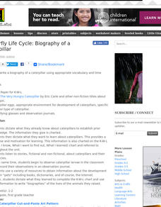 Here's a fabulous lesson on the life cycle of a butterfly. Youngsters are able to identify and understand the four stages of life. They construct models of a caterpillar and write a sequence story about the life of a butterfly. This...