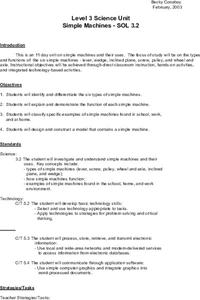Third graders examine and identify the six types of simple machines. Using a model of each simple machine, they demonstrate the state the function of them to the class. They discover examples of simple machines at school and home and...