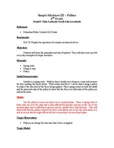 Fourth graders are introduced to a spring scale to show that the forces on both sides of the pulley are the same. They break into groups to lift objects with fixed pulleys and with multiple looped pulleys and then measure the force...