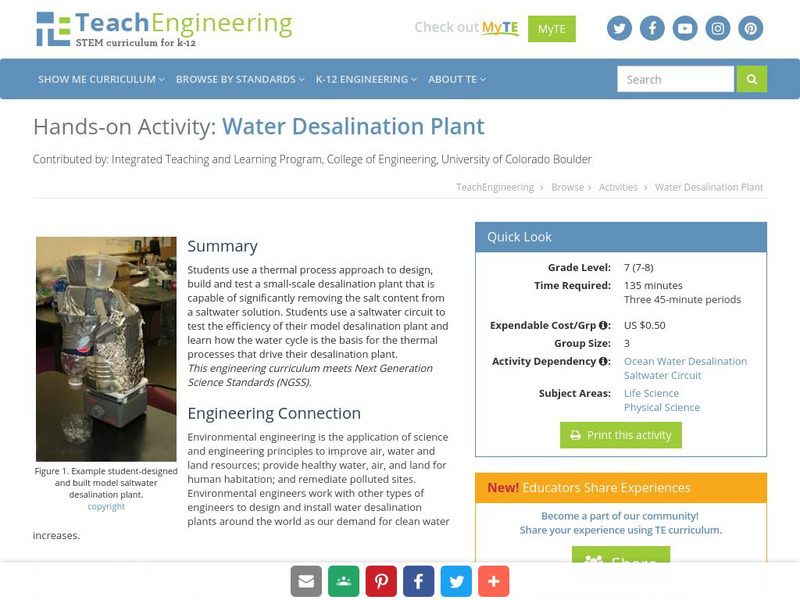 Students use a thermal process approach to design, build and test a small-scale desalination plant that is capable of significantly removing the salt content from a saltwater solution. Students use a saltwater circuit to test the...