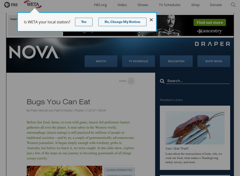 The interactive tutorial examines entomophagy (insect-eating). Some examples of bugs you can eat are witchetty grubs, silkworm pupae, and grasshoppers. The activity consists of a printable version and interactive version.