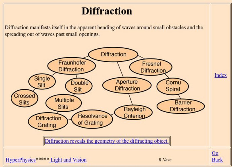 This physics department site provides links about the diffraction of light. Each page includes thorough explanations and meaningful graphics. Some pages include interactive problem-solving practice sections.