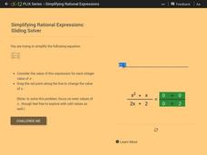 Build a strong understanding of simplified rational expression with your classes. An interactive lesson helps scholars discover the equality between the original expression and the simplified expression. Questions help individuals focus...