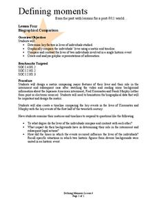 Young scholars determine key factors in lives of individuals studied. They compare the individuals' lives using a matrix and time line, compare and contrast the lives of two individuals involved in a single historic event, and create and...