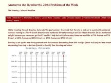In this Greeley, Colorado problem, students read a word problem. They use given directions and a coordinate plane to determine the number of ways to satisfy given travel conditions. This one-page instructional activity...