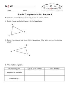 Students investigate special triangles and circles. In this geometry lesson, students construct a perpendicular bisector and discuss angles of a triangle. They find the angle bisectors, vetex and the types of circle constructed.