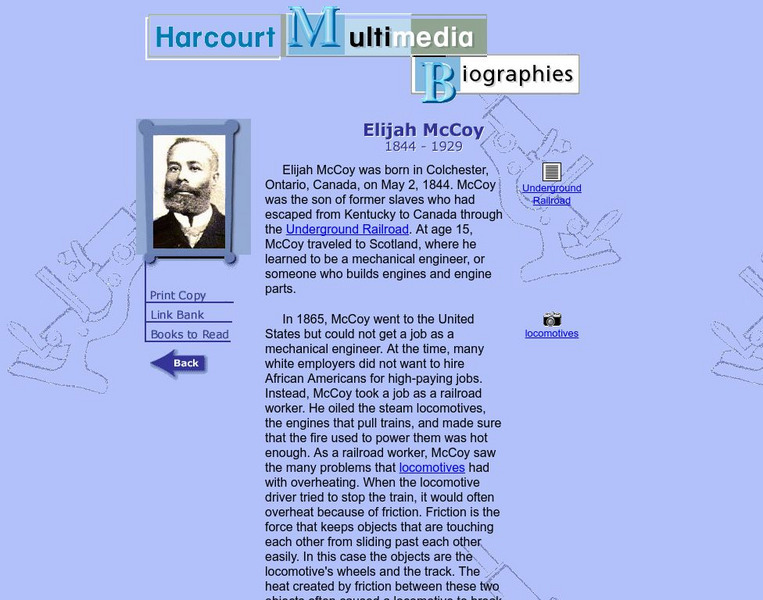 This is a great resource for information on Elijah McCoy. This mechanical engineer revolutionized the locomotive industry with his invention. Links to photographs and additional information are available also.