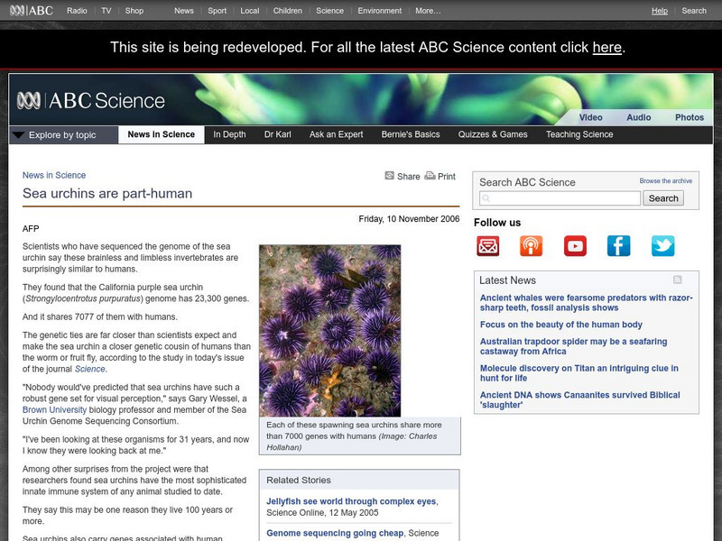 Australian Broadcasting Corporation: News in Science: Sea Urchins Are Part Human