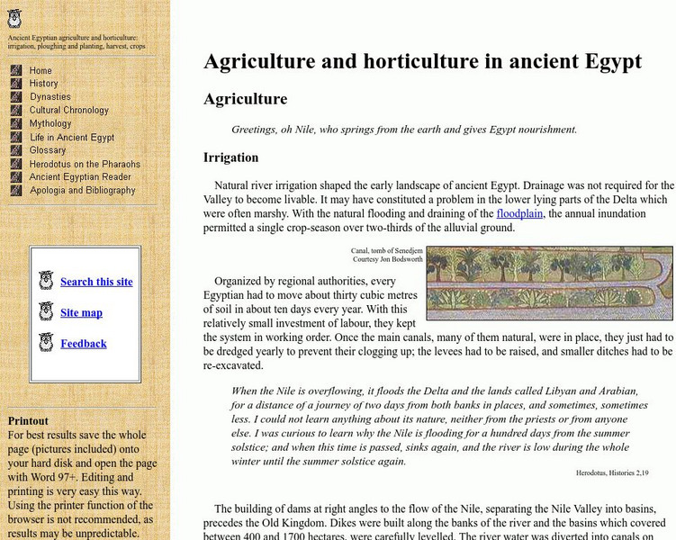 Use this site to learn about the inventions and innovations of the Ancient Egyptian farmers. This detailed article, which discusses irrigation and the Nile flooding, planting, and harvesting includes links to related articles and...