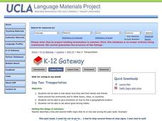 Students practice using transportation vocabulary in a foreign language. In this language arts lesson, students utilize the vocabulary terms for locations in order to give directions and find a specific place. Students answer...