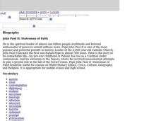 Students view a documentary on Pop John Paul II. He is the spiritual leader of almost one billion people worldwide and beloved ambassador of peace to untold millions more. After viewing, students discuss what they saw and create a...