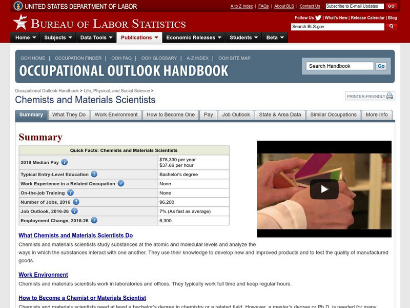 The BLS offers an overview of the career of a chemist. The website provides a general description of what being a chemist is like and includes information on the type of education and experience a chemist needs.