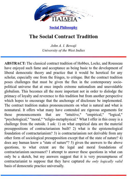 This site presents an abstract of the social contract tradition. It also contains a very detailed overview of the ideas of Hobbes, Locke, and Rousseau.