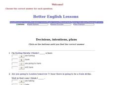 In this decisions, intentions, and plans learning exercise, students complete the multiple choice questions where they fill in the blanks to sentences about decisions, intentions, and plans. Students complete 20 problems.