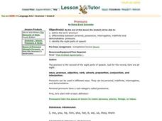 Ninth graders define the term 'pronoun', differentiate between personal, possessive, interrogative, indefinite and demonstrative pronouns, and identify the eight parts of speech.