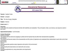 Here is a good lesson plan on butterflies and caterpillars. After listening to The Very Hungry Caterpillar, young learners put cards that depict the life cycle of a butterfly in the correct order. There are some good ideas for center...