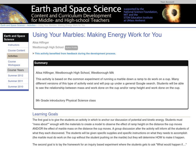 This activity is based on the common experiment of running a marble down a ramp to do work on a cup. Students will be able to see the relationship between mass and energy of the marble and the ramp height.