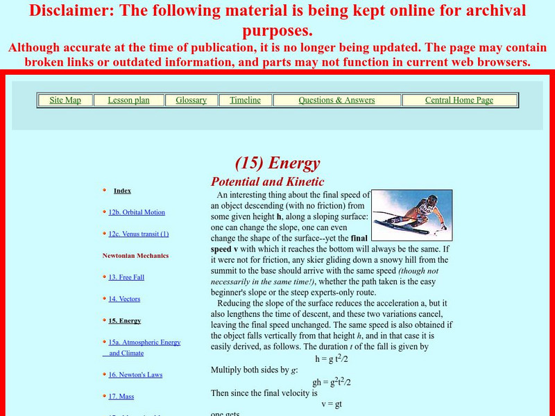Demonstrates how principles of kinetic energy, potential energy and energy conservation can be used to determine the speed of a descending object if given its initial height. Further discussion of other topics such as heat and...