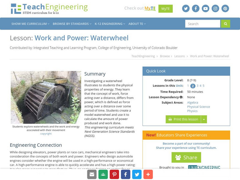 Investigating a waterwheel illustrates to students the physical properties of energy. They learn that the concept of work, force acting over a distance, differs from power, which is defined as force acting over a distance over some...