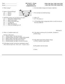 In this energy worksheet, students answer 17 questions about kinetic and potential energy. They calculate potential energy, they write formulas for kinetic energy, they solve equations for kinetic energy and they identify types of energy...