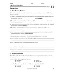 For this recycling worksheet, students review what items can be recycled, what is made from recycled items, and how recycling conserves resources. This worksheet has 5 word scramble, 10 short answer, and 5 multiple choice questions.