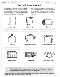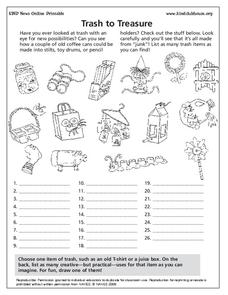 In this environmental worksheet, students learn about reusing trash and making crafts and useful items instead of throwing it into a landfill. Students study 15 pictures of crafts and list as many trash items as they can find.
