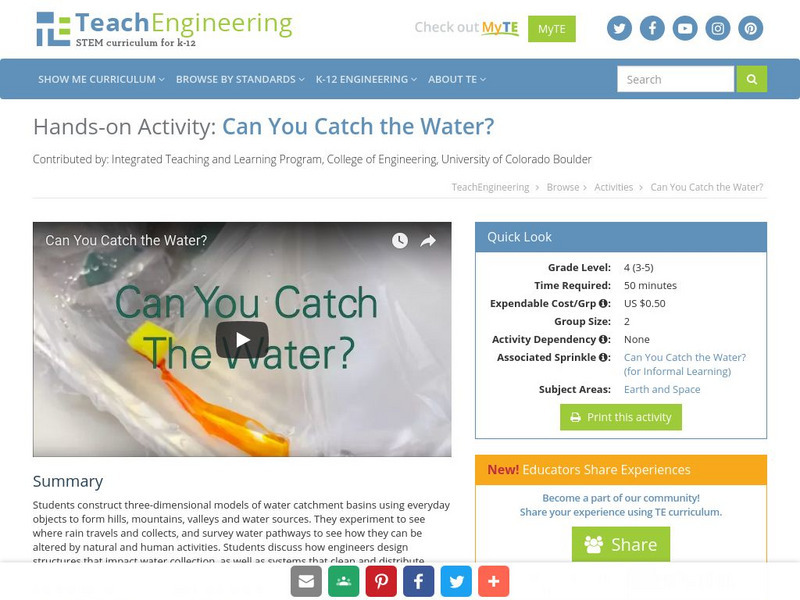 Students construct a three-dimensional model of a water catchment basin using everyday objects to create hills, mountains, valleys and water sources. They experiment to see where rain travels and collects, and survey water pathways to...