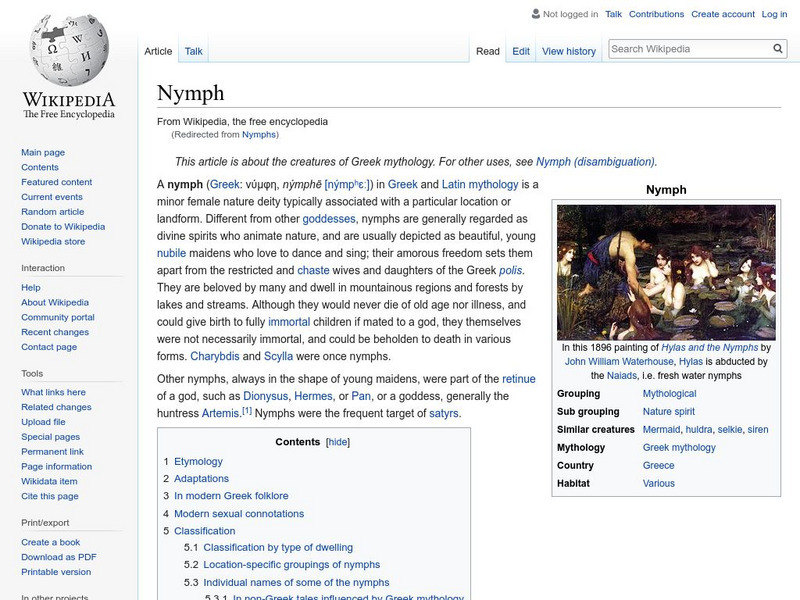 Encyclopedia article about nymphs in Greek mythology, "any member of a large class of female nature spirits, sometimes bound to a particular location or landform." Discusses classifications of nymphs and provides a picture as well.