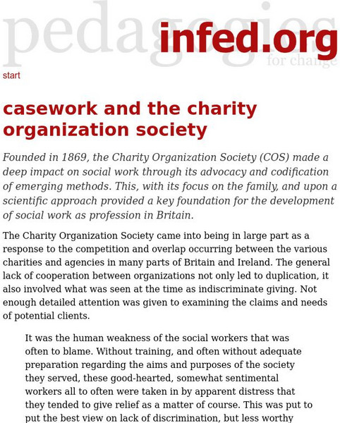 Here's a brief history the the Charitiy Organization Society and the reasons behind its formation. Included is a discussion of the philosophy of social work in the late 19th century.
