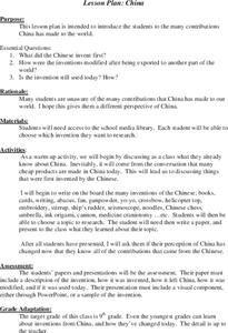 Ninth graders are introduced to the many contributions China has made to the world. They research and choose an invention to find information on. They will have to use an internet resource tool to guide them for their presentation of...