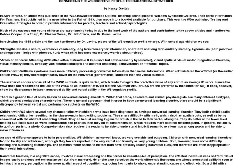 Beginning with references to several articles written on Williams Syndrome (WS), this site provides an outline efficient for educators to follow when teaching children with WS and writing IEP's. Williams Syndrome is compared to a...